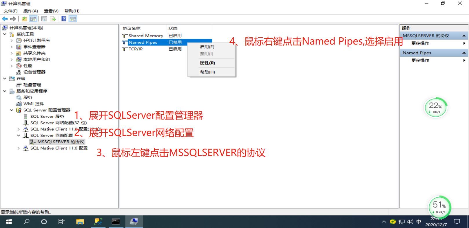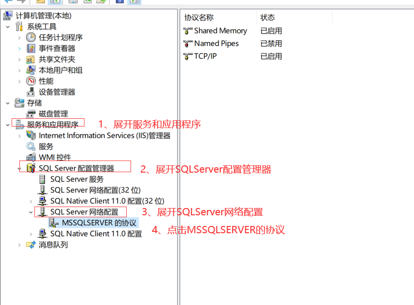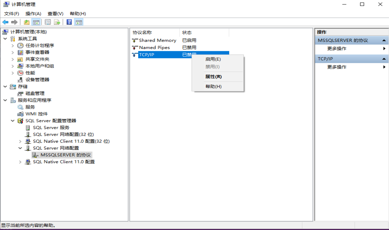 1、在计算机管理-》展开SQLServer配置管理器-》展开SQLServer网络配置-》鼠标左键点击MSSQLSERVER的协议-》选择Named Pipes-》右键点击-》点击启用。