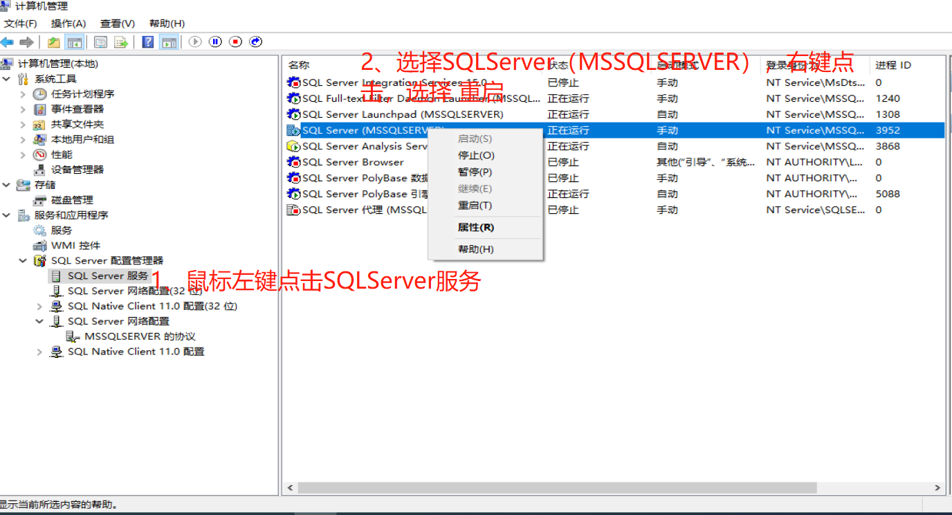 2、在SQLServer配置管理器-》鼠标左键点击MSSQLSERVER服务-》选择SQLSERVER(MSSQLSERVER),右键点击-》选择重启。