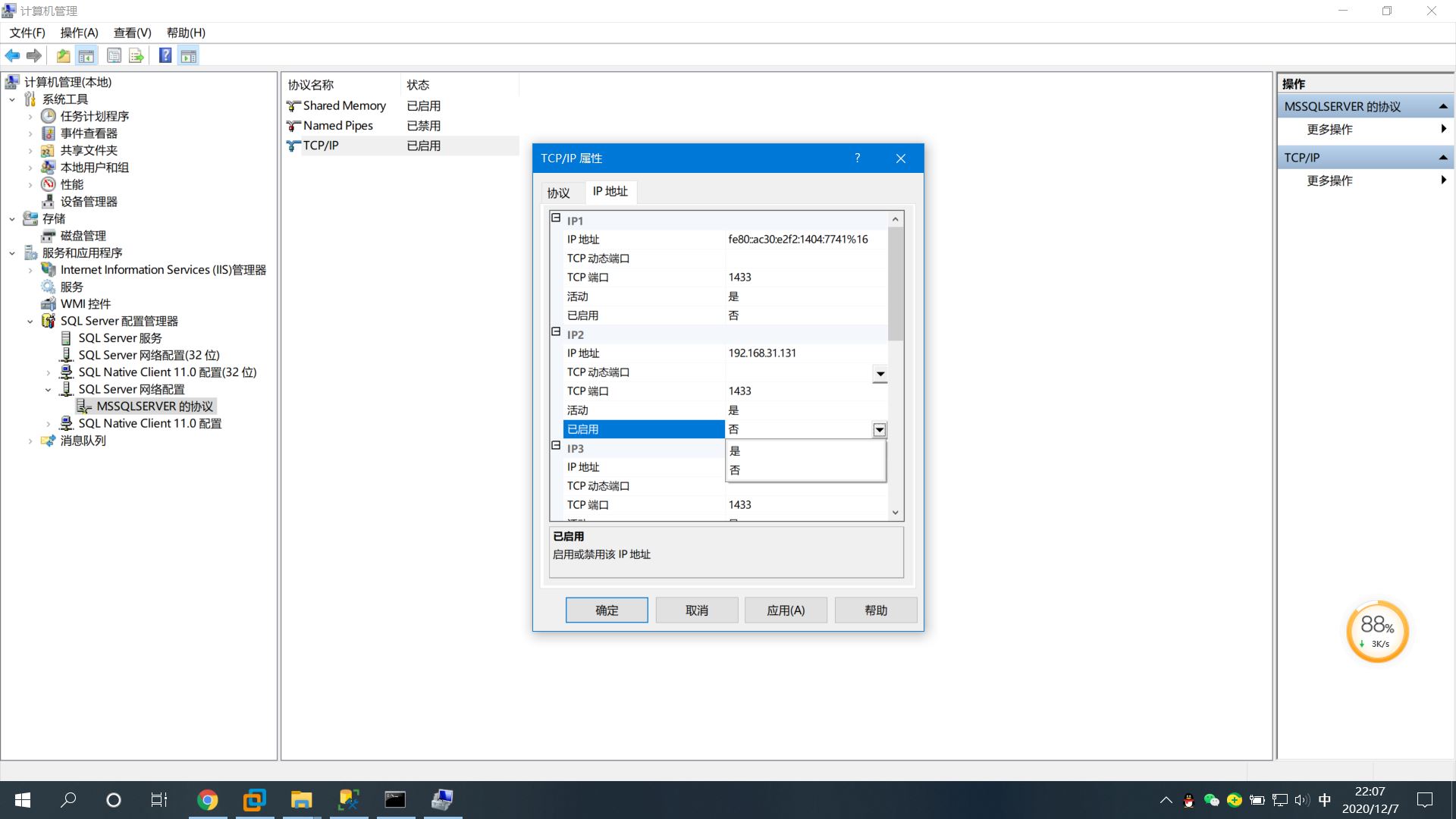 6、在TCP/IP弹出框-》找到IP2-》已启用由否改为是-》点击下方应用按钮-》点击确定按钮。