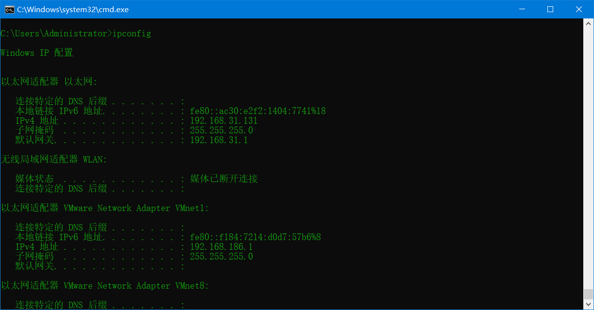 9、在dos命令窗口中输入ipconfig命令查看本机ip。