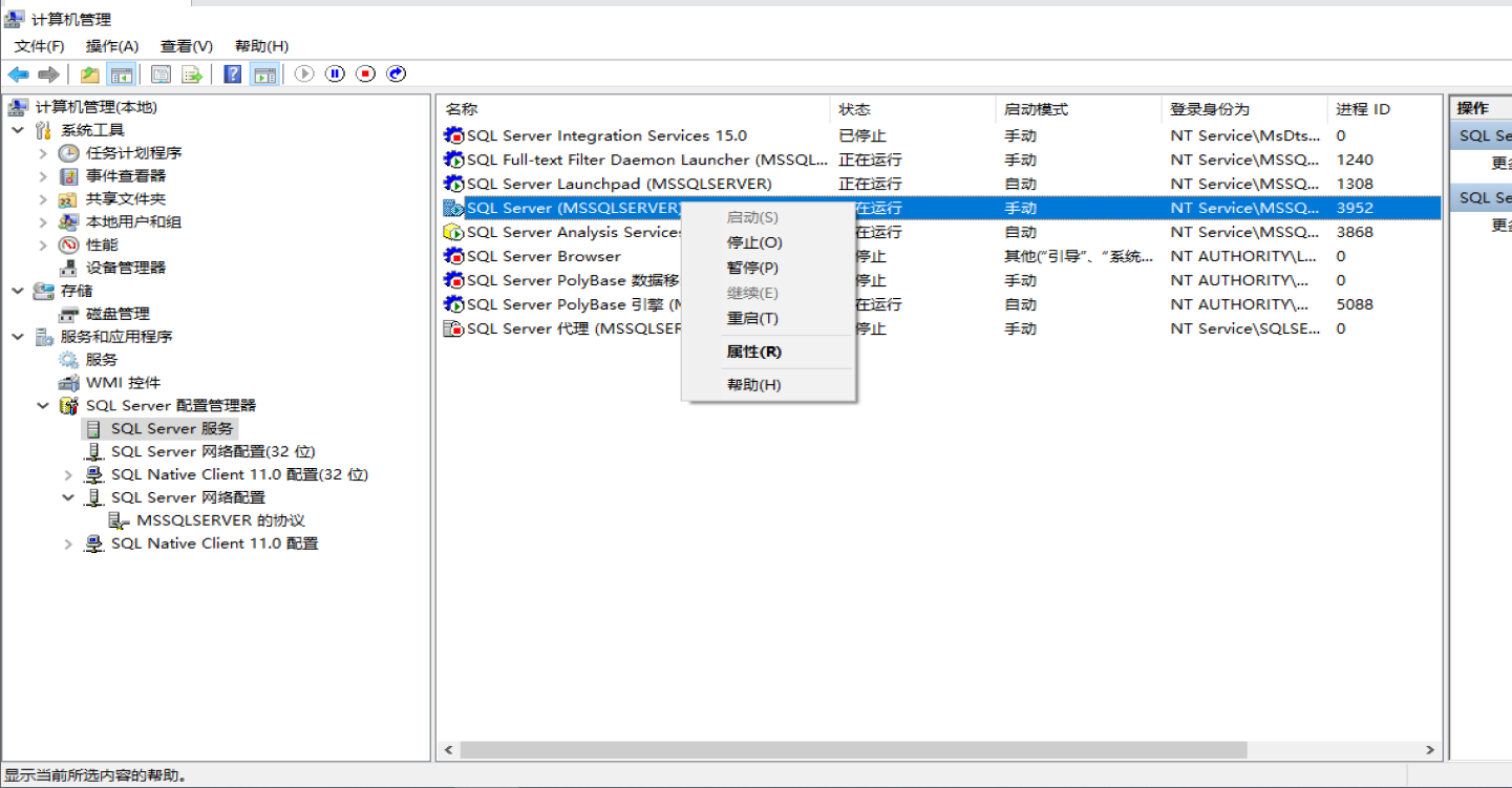 8、找到SQLServer(MSSQLSERVER)服务-》右键点击-》选择重启-》等待重启完成。