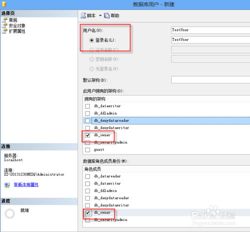 将刚才用户名输入即可,然后勾选用户架构和角色;这里就勾选db-owner(拥有完全权限)