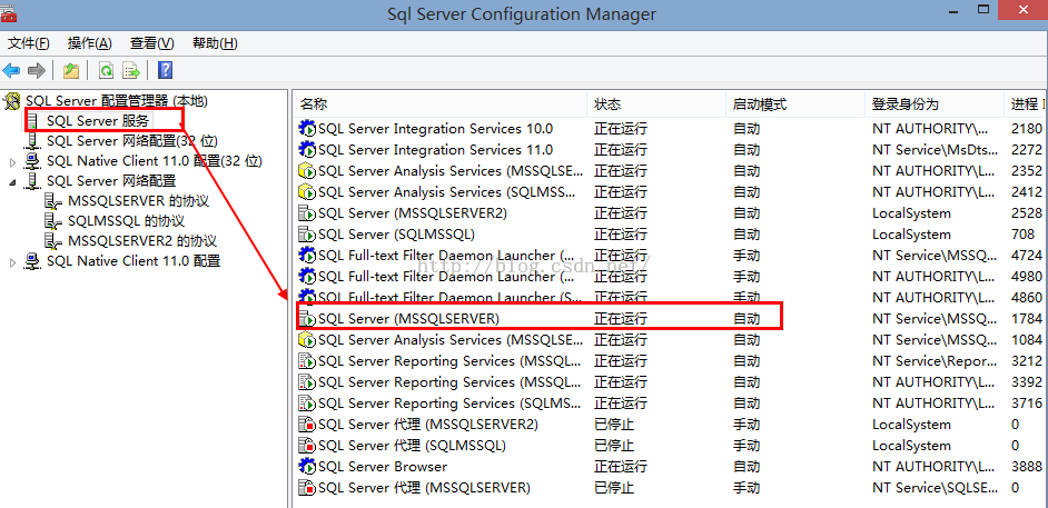 然后将SQL Server服务中的SQL Server(MSSQLSERVER)服务启动。