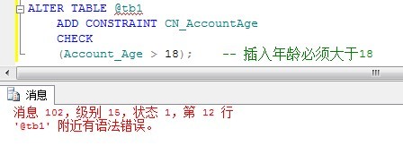 再来试试一些不符合要求的情况,例如添加表变量后,添加约束,并对约束命名: