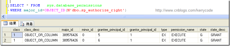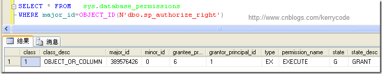 此时,已经实现了拥有DML操作权限,如果需要拥有存储过程和函数的执行权限,必须使用GRANT语句去授权,一个生产库的存储过程和函数加起来成千上百,如果手工执行的话,那将是一个辛苦的体力活,而我手头有十几个库,所以必须用脚本去实现授权过程。下面是我写的一个存储过程,亮点主要在于会判断存储过程、函数是否已经授予了EXE或SELECT权限给某个用户。这里主要用到了安全目录试图sys.database_permissions,例如,数据库里面有个存储过程dbo.sp_authorize_right,如果这个存储过程授权给Test用户了话,那么在目录试图sys.database_permissions里面会有一条记录,如下所示: