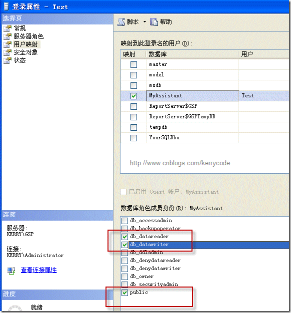 在工作当中遇到一个类似这样的问题:要对数据库账户的权限进行清理、设置,其中有一个用户Test,只能拥有数据库MyAssistant的DML(更新、插入、删除等)操作权限,另外拥有执行数据库存储过程、函数的权限,但是不能进行DDL操作(包括新建、修改表、存储过程等...),于是需要设置登录名Test的相关权限: