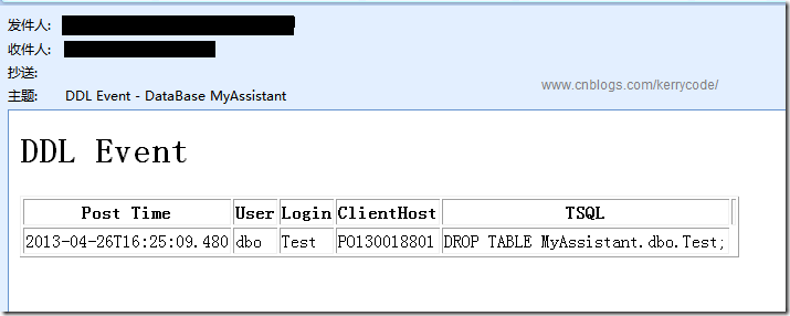 接下来我们来测试一下,假如一个用户Test登录数据库,一不小心删除了一个Test的表,如下图一所示,那么我将收到一封邮件,提示我用户Test在那台客户端主机执行了啥DDL操作(如下图二所示),当然邮件的样式、排版有兴趣的可以去美化一下。