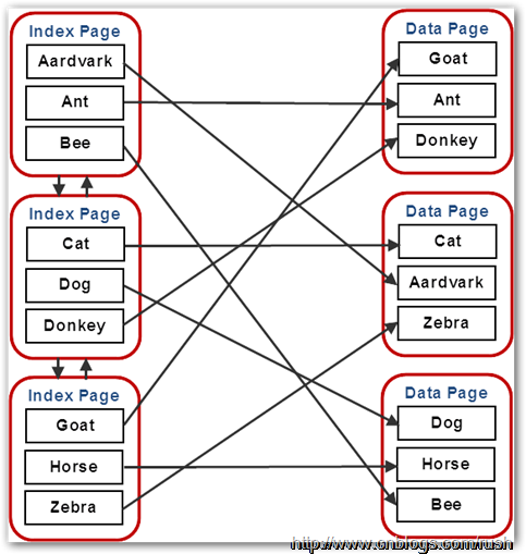 如上图4所示,索引叶节点包含索引值和相应的RID(ROWID),而且叶节点通过双向链表有序地连接起来;同时我们主要到数据表不同于索引叶节点,表中的数据无序存储,它们不全是存储在同一表块中,而且块之间不存在连接。