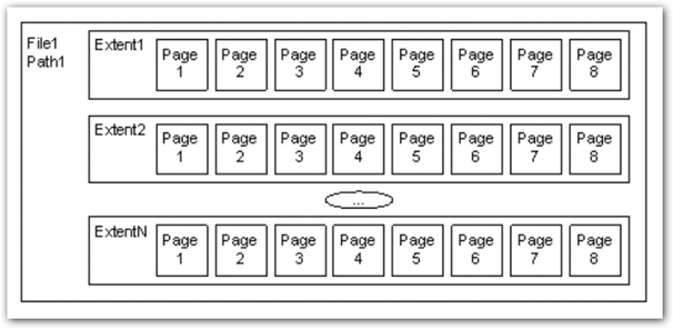 在物理层面上,数据库有数据文件组成,而这些数据文件可以组成文件组,然后存储在磁盘上。每个文件包含许多区,每个区的大小为64K由八个物理上连续的页组成(一个页8K),我们知道页是SQL Server数据库中的数据存储的基本单位。为数据库中的数据文件(.mdf 或 .ndf)分配的磁盘空间可以从逻辑上划分成页(从0到n连续编号)。