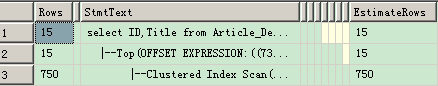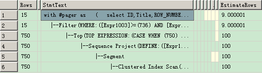 执行计划只有3行,并且占用资源 100% 的IO 操作 ,EstimateRows = 100 和 Rows = 750 是和 ROW_NUMBER() 完全一样的,但是其他的一些操作却少了很多,也就是说,并没有全表扫描,并降低了CPU 的消耗。