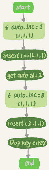 如果字段id被定义为AUTO_INCREMENT,在插入一行数据的时候,自增值的行为如下: