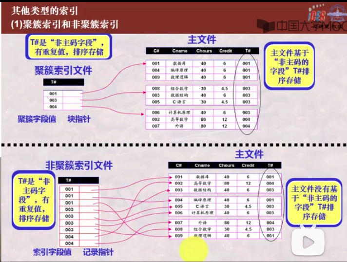 如果主文件的某一排序字段不是主码,则该字段上每个记录取值不唯一,此时该字段称为聚簇字段;聚簇索引通常是定义在聚簇字段上;聚簇索引通常是对聚簇字段上的每一个不同值有一个索引项(索引项的总数和主文件中聚簇字段上不同值的数目相同),索引字段即是聚簇字段的不同值,由于有相同聚簇字段值的记录可能存储在若干块中,则索引项的指针指向其中的第一块。一个主文件只能有一个聚簇索引文件,但可以有多个非聚簇索引文件。主索引通常是聚簇索引(但其索引项总数不一定和主文件中聚簇字段上不同值的数目相同,其和主文件存储块数目相同);辅助索引通常是非聚簇索引。主索引/聚簇索引是能够决定记录存储位置的索引;而非聚簇索引则只能用于查询,指出已存储记录的位置。
