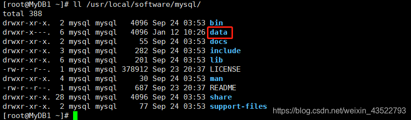[root@MyDB1 software]# ln -s mysql-8.0.22-el7-x86_64/ mysql #创建链接,方便操作