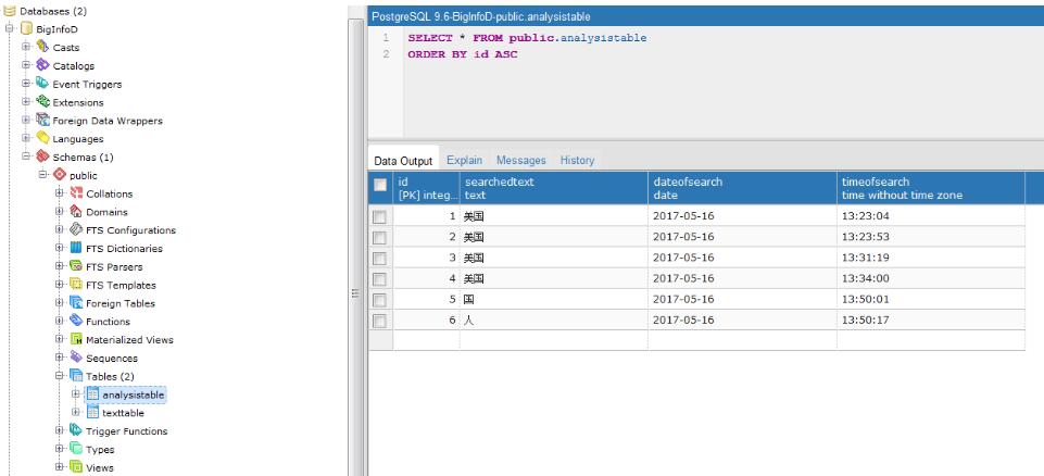 CREATE TABLE public.analysistable ( id integer NOT NULL DEFAULT nextval('analysistable_id_seq'::regclass), searchedtext text COLLATE pg_catalog."default" NOT NULL, dateofsearch date NOT NULL, timeofsearch time without time zone NOT NULL, CONSTRAINT analysistable_pkey PRIMARY KEY (id) ) WITH ( OIDS = FALSE ) TABLESPACE pg_default; ALTER TABLE public.analysistable OWNER to king;