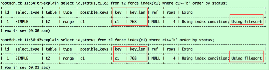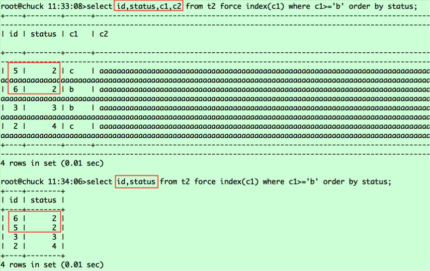 select id,status,c1,c2 from t2 force index(c1) where c1>='b' order by status;