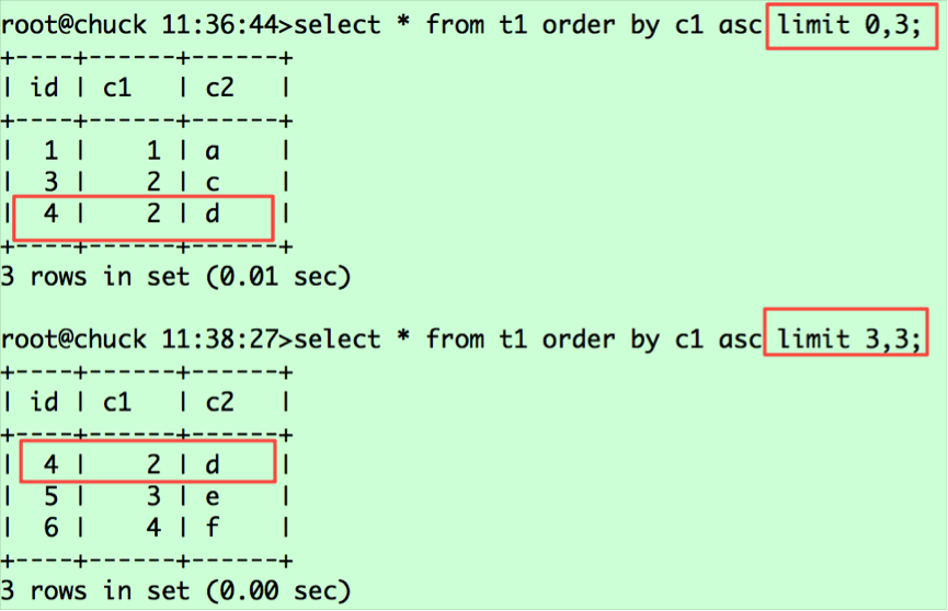 我们可以看到 id为4的这条记录居然同时出现在两次查询中,这明显是不符合预期的,而且在5.5版本中没有这个问题。产生这个现象的原因就是5.6针对limit M,N的语句采用了优先队列,而优先队列采用堆实现,比如上述的例子order by c1 asc limit 0,3 需要采用大小为3的大顶堆;limit 3,3需要采用大小为6的大顶堆。由于c1为2的记录有3条,而堆排序是非稳定的(对于相同的key值,无法保证排序后与排序前的位置一致),所以导致分页重复的现象。为了避免这个问题,我们可以在排序中加上唯一值,比如主键id,这样由于id是唯一的,确保参与排序的key值不相同。将SQL写成如下: