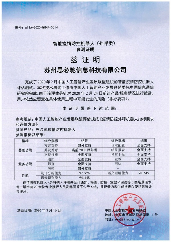 思必驰疫情机器人参加AIIA评估测试参测证明
