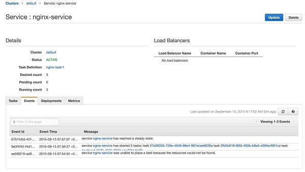 然后回到ECS面板,就可以检查服务了,当然我们希望看到的是它处于准备好的状态,且拥有3个任务。