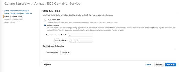 选择创建服务的单选框,为服务命名,本例为nginx-service,然后设置要运行的任务数,本例为3。这就意味着此服务一旦运行起来,就会创建3个任务,每个任务就是一个独立的实例,每个实例中都运行着nginx容器。