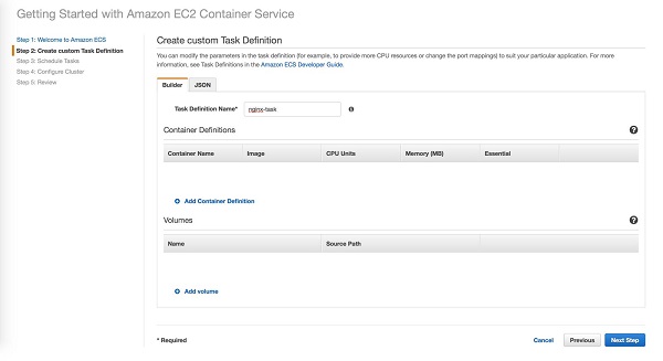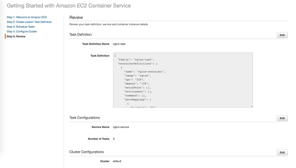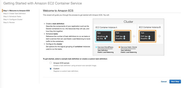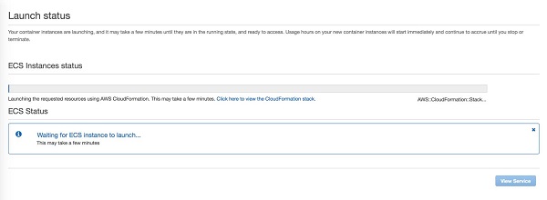 当用户第一次使用终端访问ECS服务时,会看到一个简单的向导。尽管手动的去配置ECS也不是多么繁重的事情,但是第一次的话,使用该向导还是值得尝试的,它能够为你配置好所有-你的EC2服务器,一个合适的安全组,以及一个自动伸缩组,正确的AMI(此AMI内置了ECS代理),等等。这是启动和运行,并获得ECS经验的最快方法。