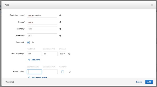 接下来,点击添加容器定义,即定义nginx容器。 这里主要需提醒的是镜像的名称,务必和Docker hub(ngnix)上公开的镜像名称一致。当然,也可以指定专有镜像。