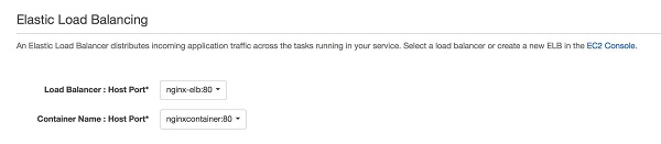 要配置负载均衡,我们首先需要在EC2的面板中创建一个ELB。然后重新创建服务,在服务创建的过程中将ELB添加进来,如下面截图所示: