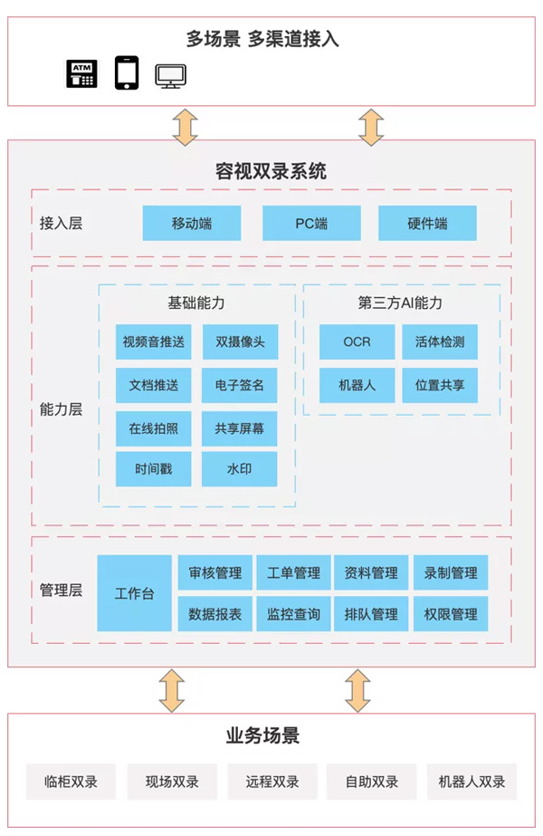 线上/远程/智慧网点的移动优先战略是金融业未来的趋势,搭建智能服务能力平台,容联正在通过音视频API/SDK/H5+智慧双录的产品打造金融业“空中营业厅”。