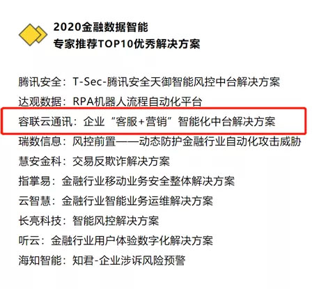 1、“2020金融数据智能专家推荐TOP10优秀解决方案”,也是TOP10中金融智能营销领域唯一入榜企业。