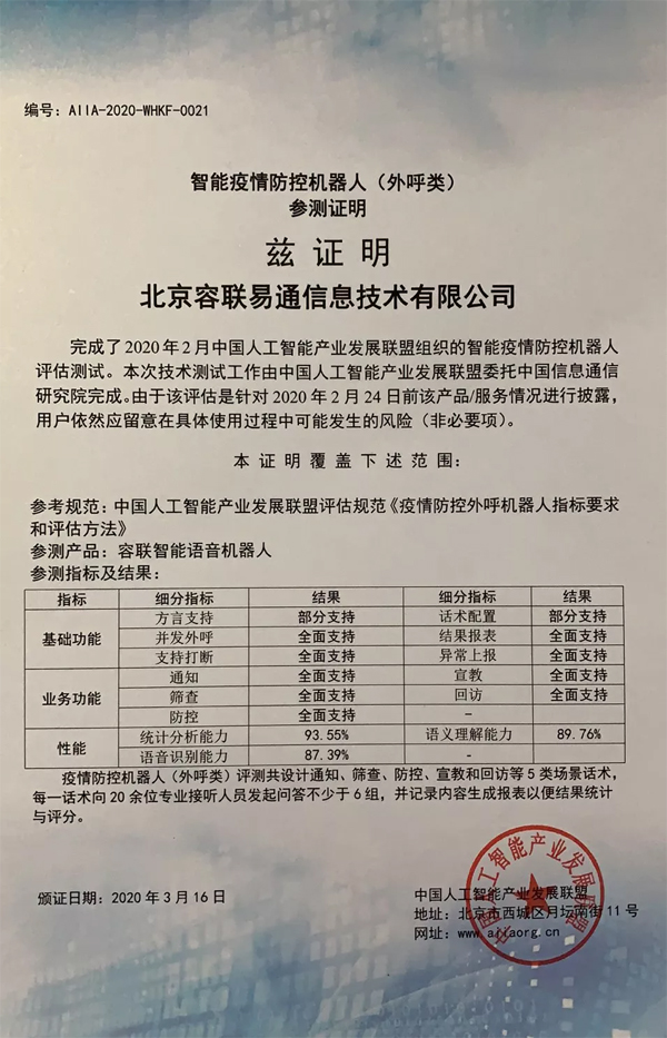 疫情防控期间,AIIA中国人工智能产业发展联盟,依托中国信息通信研究院和人工智能关键技术和应用评测工业和信息化部重点实验室,开展了面向疫情防控机器人的评估测试,容联疫情防控机器人(在线类)+(外呼类)多项指标表现优异。