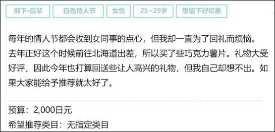咨询发布后,接下来只需要耐心等待来自其他用户的礼物点子了。通过PitaPre给出建议的用户8成都是女性,因此可以从接受方的角度请教“义理巧克力回礼”的问题。