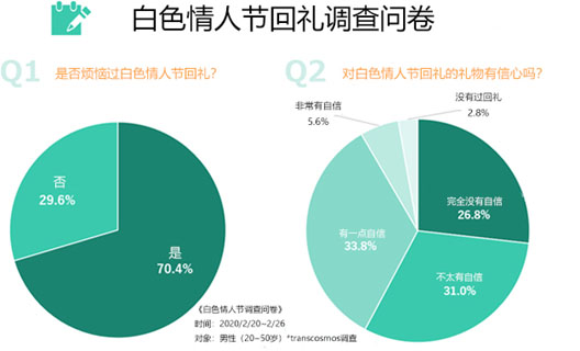 事实上,有7成以上的男性为选择白色情人节回礼而烦恼,更有调查结果显示,对于自己选择的礼物,超过半数的男性回答是“没有自信”。《白色情人节问卷调查(transcosmos调查)》