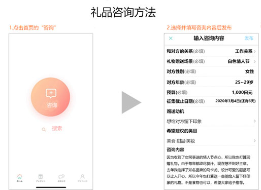 用户选择赠送对象的属性、关系、场景和预算后,只需填写咨询内容即可发布。因此可以灵活地利用闲暇时间进行简单咨询。