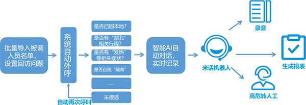 此外,米话·疫情防控回访智能语音机器人的巡检功能可用于每天定时电话各区乡镇村等站点负责人确认辖区是否正常,有无发病等情况,其轮震功能可保证各级基层组织的信息能够快速上传。