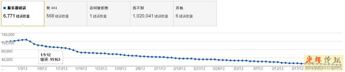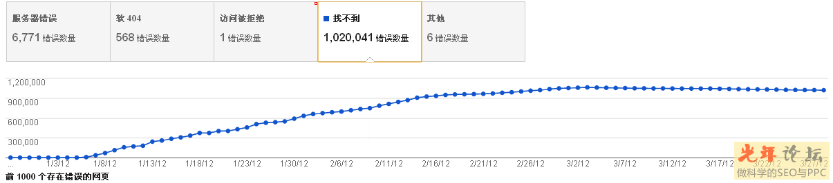 下面是另一个网站由于改版问题没做跳转和抓取拦截所造成的找不到抓取错误,有一很完整的曲线可以让你很清晰的看见网站存在的这方面的问题的变化趋势