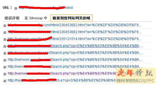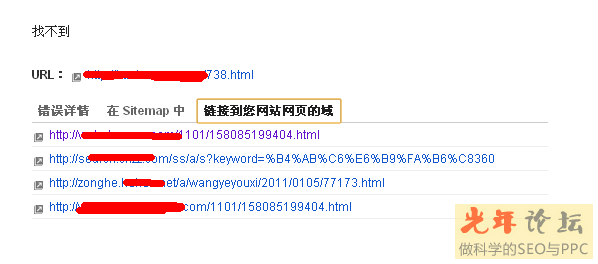 点击第102条,弹出下面的框,url不在sitemap中,但是在自己的其他网站里面出现,说明网址是网站自身存在的但是已经被删除了
