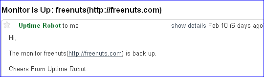 而当你的网站恢复正常时,Uptime Robot 也会给你发送一份邮件通知: