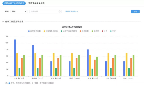 目前市面上的远程协助服务软件,不能提供监控状态、满意度等报表功能,也无法直观的在系统中展示坐席工作情况。某餐饮软件客户,日常维护过程中由于技术故障或用户不懂得如何操作,监管员无法统计远程服务工作的满意度和质量。七陌远程协助功能方便客服人员在平台上有效的沟通和处理问题,提升服务质量和效率;更好的帮助客户使用软件,解决使用问题,提高服务质量,统计服务状态。