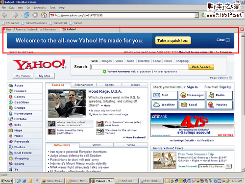 我曾经做过个方案规定“改版体验的提示必须在整个页面加载完成2秒之后,从上往下滑出推动整个页面,以求更明显让用户注意的效果。”因为在页面加载过程中,所有对象都在从无到有的移动显示,如果在整个页面相对静止之后,突出更重要的“改版提示”,效果会顺畅很多。同样的结论还可以用在帮助提示,或某些新功能贴“标签”上。下图为雅虎官方新改版的测试邀请。