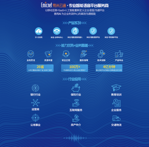 以为众多大中型企业定制智能语音解决方案的专业智能语音平台服务商--易米云通所搭建的智能语音平台为例,易米云通在全国26省、300+城市与运营商合作开展正规业务,高质量的ASR语音识别,NLP自然语言理解,高拟人化的TTS语音合成,既可支持通话高并发量,还可保证外呼质量。