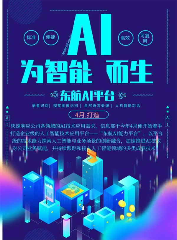 费控智能客服机器人的上线,标志着东航已初步建立起了自有AI能力,并逐渐步入AI落地应用的快车道。当前,人工智能作为引领未来的战略性技术,在越来越多的业务场景上发挥着越来越大的作用。为了能将人工智能转化为标准、便捷、高效、可复用的技术能力,快速响应公司各个业务领域的AI技术应用需求,信息部于今年4月便开始着手打造企业级的人工智能技术应用平台——“东航AI能力平台”,探索人工智能与业务场景的创新融合,加速推进AI技术对公司业务赋能。平台至今已经拥有语音识别、视觉图像识别、自然语言处理、人机智能对话等多种AI能力,并持续跟踪和接入人工智能领域的多类成熟技术,从而快速、便捷地赋能业务。