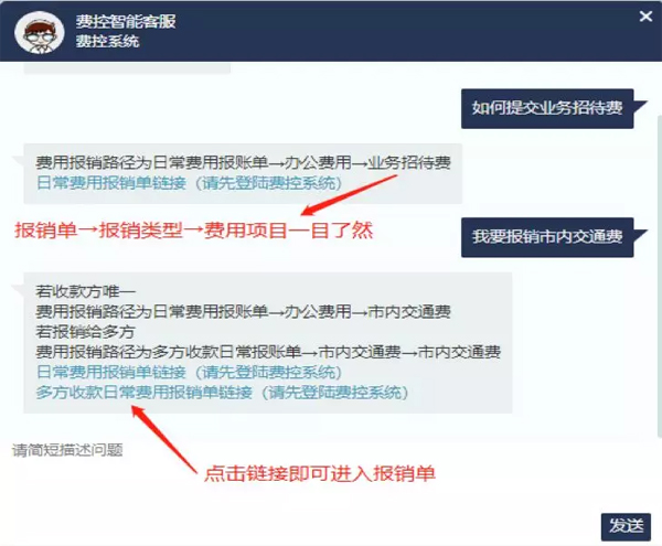 员工们只要轻轻一点就能立刻在线咨询系统操作、报销规定等各类财务报销问题,“小秘书”不仅能在第一时间给出答案,还能根据关键词猜出员工们想要问的问题,甚至还能根据提问的费用项目自动匹配报销单链接,一键自动创建报销单,从而给员工们带来7*24小时实时在线的便捷服务体验。
