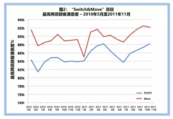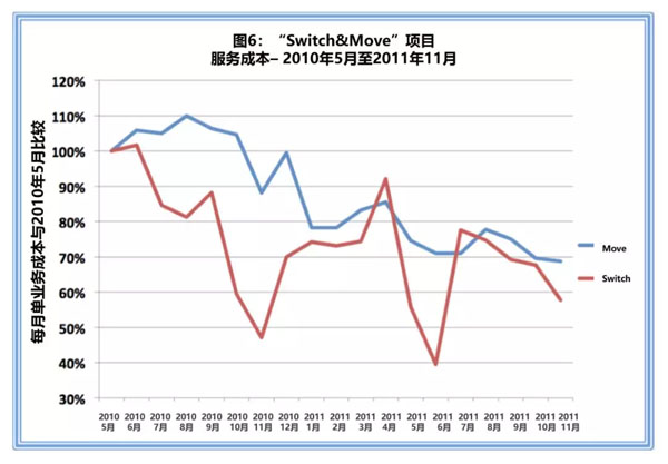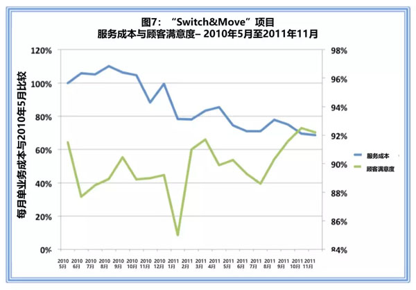 如图7所示,该公司在服务质量和顾客满意度方面实现了同步改进,服务成本降低了30个百分点,“Switch Move”项目中的顾客满意度增加了6个百分点。