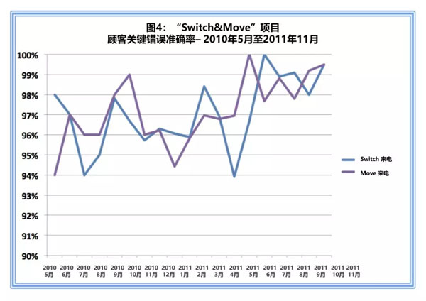 如图4所示,Nuon的顾客满意度改进是基于通过提高关键准确性来提高服务和质量。在“Switch Move”项目中,关键信息准确率提高了近6个百分点,达到基准水平。