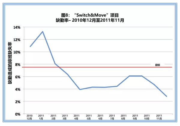 如图8所示,在“Switch Move”项目中,客服缺勤率也下降了近8个百分点,从而进一步提高了效率并节约了成本。