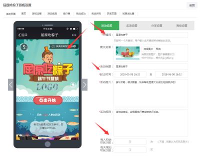 第三步:.点击游戏库,找到游戏位置,里边有最新的游戏,所有游戏制作过程和参与方式都是一样的,教程以屈原吃粽子为例子,鼠标点击游戏图标右边的我要定制按钮,就进到编辑页面了。可以看到左边是预览框,上面是导航菜单,右侧是编辑区域,切换到需要编辑的选项,在预览框里点一下,就可以在右侧修改了。