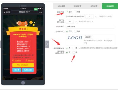 第四步:奖项设置,选择类型,设置数量,注意兑奖时间的设置要在游戏结束以后,然后切换到高级设置,设置虚拟人数、排行榜显示数、版权及上传Logo,关键是最后两项,设置需要关注和设置需要填写手机号,设置完以后点击保存,提示设置成功,然后弹窗是否发布.