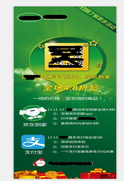 在分析完用户心理后,他们开始着重进行活动策划的相关安排。活动是以线上线下同步展开的方式进行。活动内容主要以商品打折为噱头。4.8折的商品折扣已足够吸引力,如果再免费送到家呢?而且使用京东APP与支付宝的用户,在4.8折的基础上将另有优惠,在几重优惠的吸引下,他们相信用户一定会被打动。