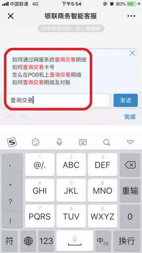 首先,用户输入问题时,如用户要查询交易卡号,输入“查询交易”后,输入栏上方就会出现与“查询交易”相关的完整问题,其中就包括“如何查询交易卡号”,用户只需点击即可获取答案。