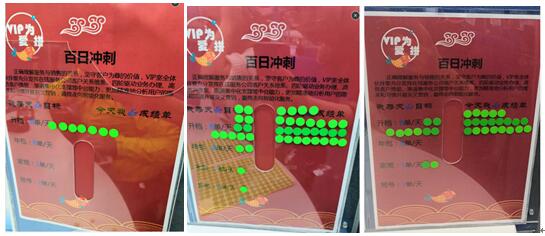 3)座席贴晒营销成绩:全室每位员工座席贴一张营销成绩单,每卖一单,员工就贴一个小绿点,促进室内你追我赶的氛围: