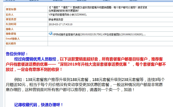三、打造“爆款营销”产品:通过学习公司的营销案、向营销优秀员工学习,向全室推出《爆款“”爆款“!营销案超好卖的套餐升档营销提醒,每个客户都可以推荐!》的软文,迅速让员工重点推荐好卖的业务,重点是所有套餐客户的升档,员工运用后发现好用,快速提升员工营销的信心。